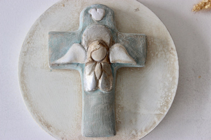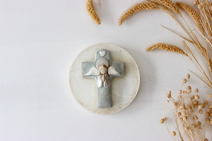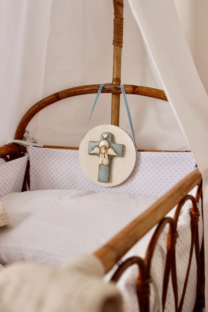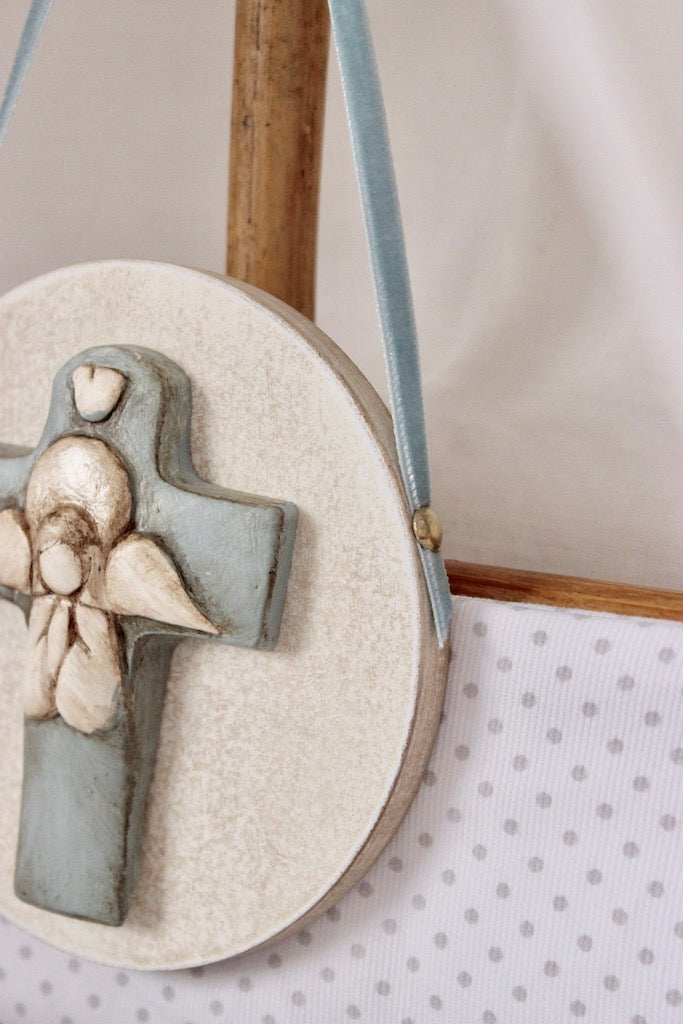 Medallón de cuna en azul empolvado con ángel de la guarda. Se puede colgar de la cuna con una cinta o comprar con arandela detrás para colgar en la pared.