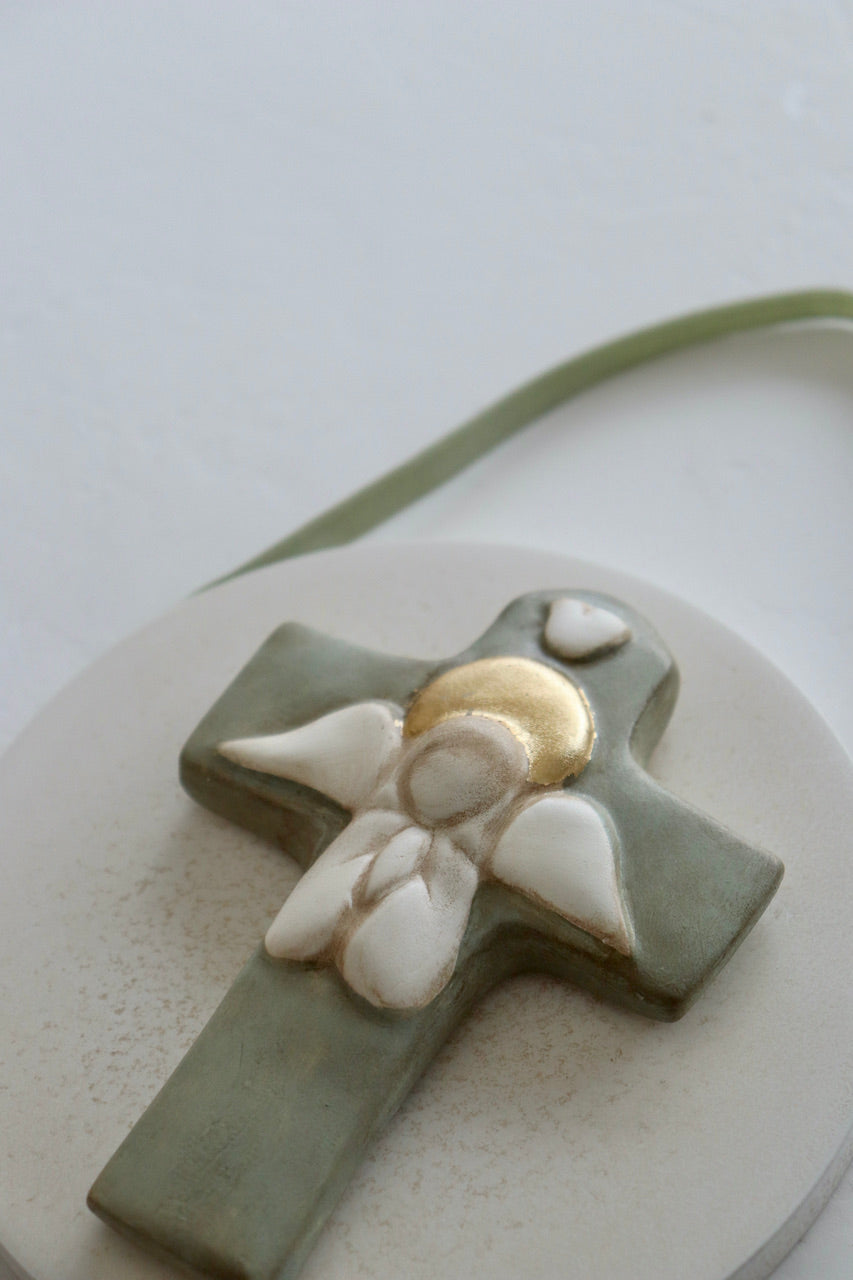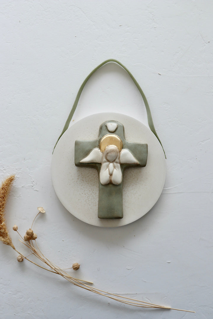 Medallón de cuna en tonos verdes y neutros con ángel de la guarda. Se puede colgar de la cuna o pared con una cinta o comprarlo con arandela detrás para colgar en la pared.
