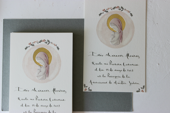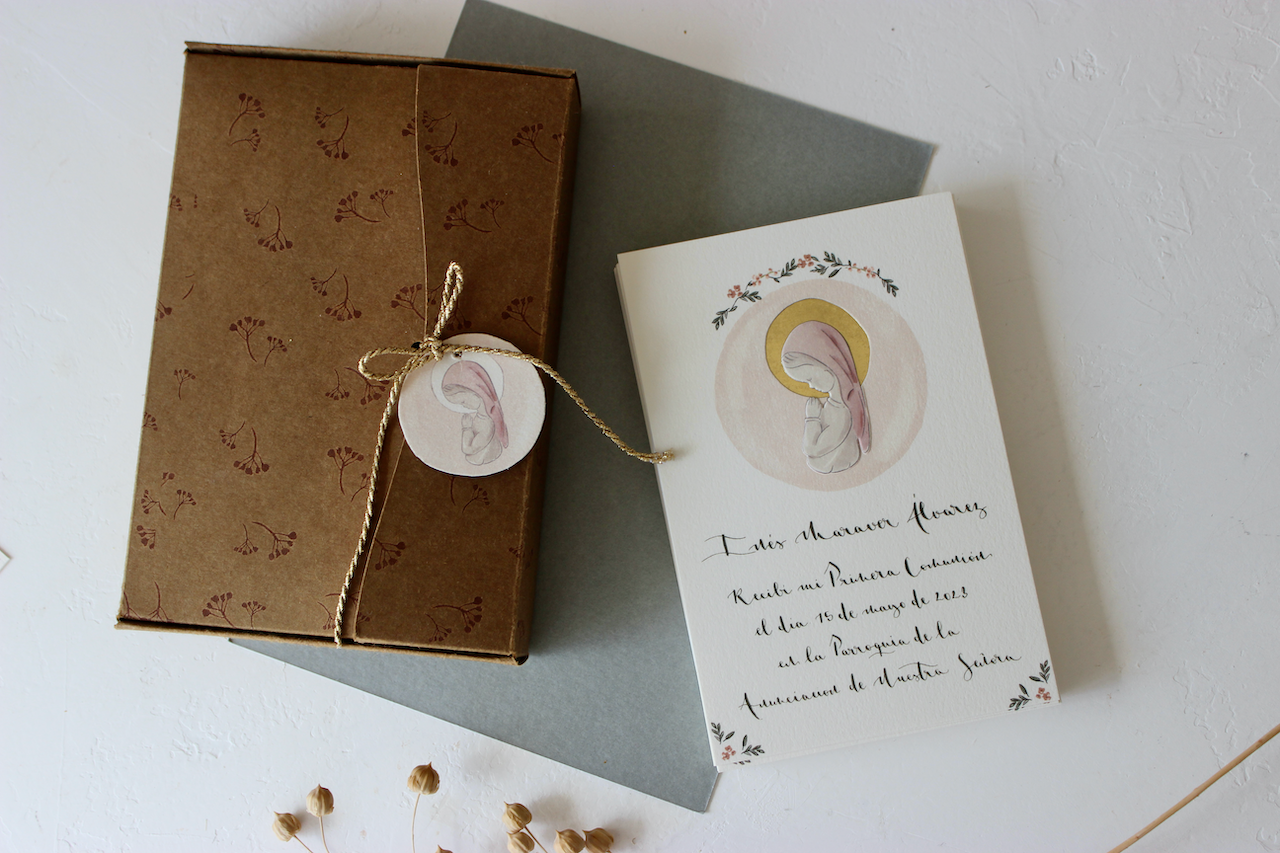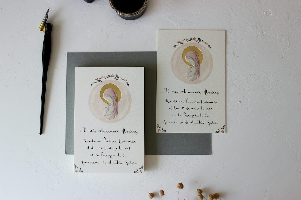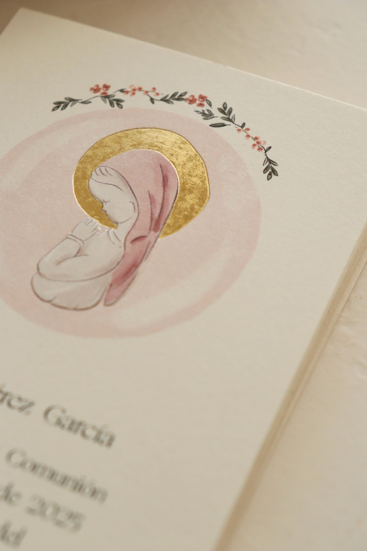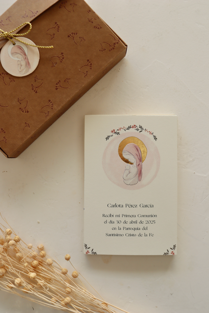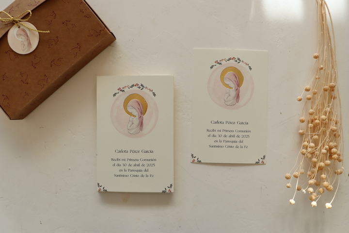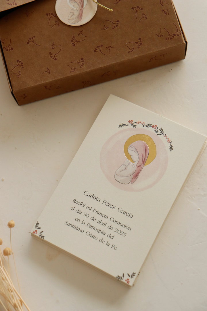 Están ilustrados con nuestra Virgen niña e impresos siguiendo diferentes técnicas artesanales en un papel de alta calidad, con la figura de la virgencita en relieve y su corona con efecto dorado.
