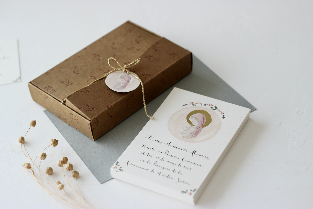 El pack contiene 30 unidades que enviamos en su estuche de flores a medida. Nuestros recordatorios se pueden encargar con caligrafía a mano digitalizada o con tipografía.
