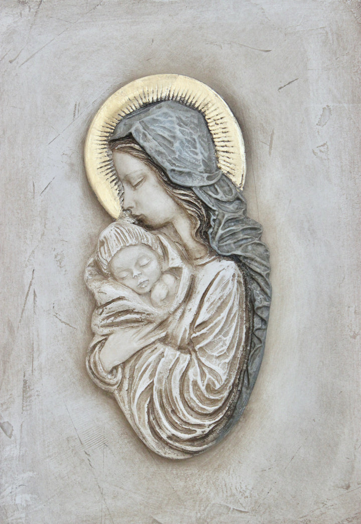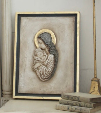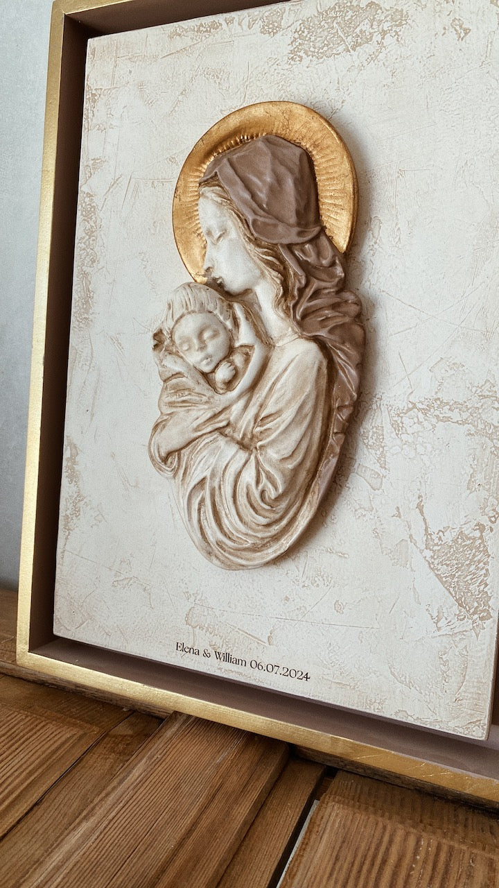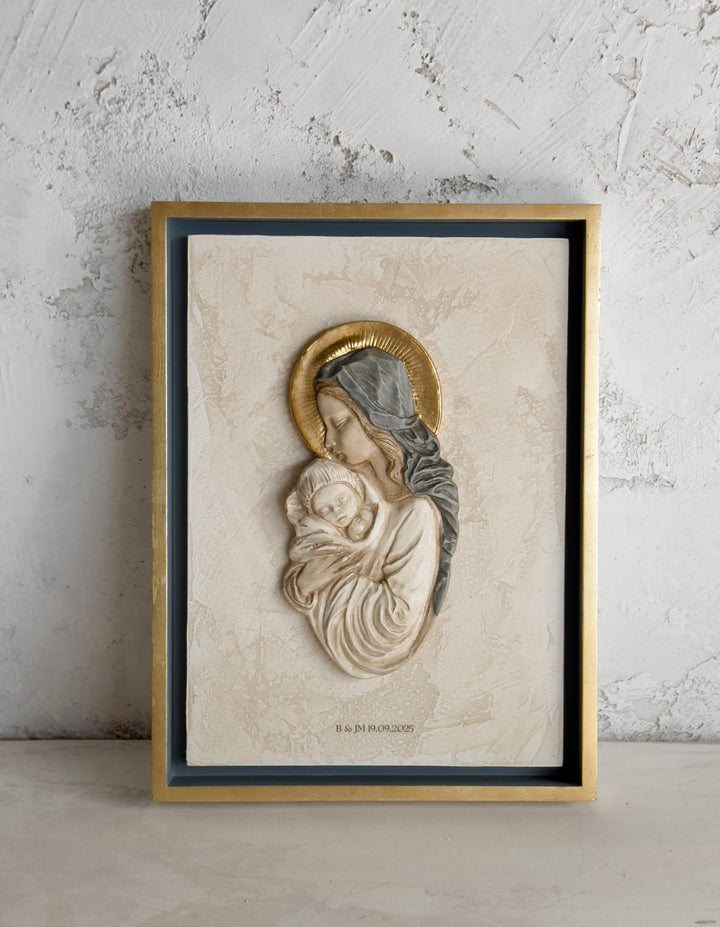 Como todas las virgencitas que salen del taller, nuestra nueva Virgen María está hecha aquí desde cero, de forma 100% artesanal. Tanto el marco, el retablo, como la imagen de la virgen. Hemos creado una composición con el efecto de un retablo antiguo, enmarcada en un cajón de madera con el frontal en pan de oro, como la corona de la virgen. El interior del cajón está pintado con el mismo tono azul empolvado que lleva el manto. El retablo central está tratado y envejecido en el taller con efecto piedra. Está llena de detalles que la hacen especial. Por fin una virgen perfecta para regalar a tu madre, a tu abuela, a tu amiga que se casa. Hemos querido cuidar mucho su packaging, os la enviamos en una caja a medida en color rosa maquillaje con el logo impreso en dorado. Esta virgen quedará perfecta en la entrada de casa, en el salón, en un dormitorio... No nos olvidamos de algo que para nosotras es fundamental: la ternura. La ternura que ponemos en nuestro trabajo y que queremos transmitir con todos nuestros productos.