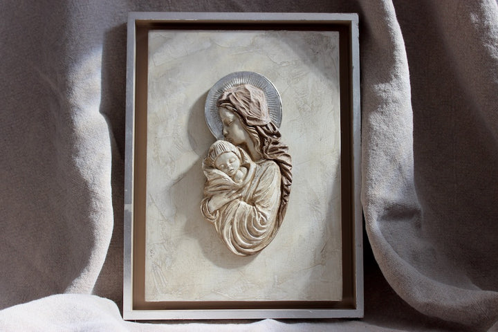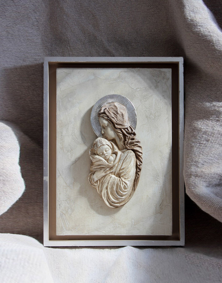 Como todas las virgencitas que salen del taller, nuestra nueva Virgen María está hecha aquí desde cero, de forma 100% artesanal. Tanto el marco, el retablo, como la imagen de la virgen. Hemos creado una composición con el efecto de un retablo antiguo, enmarcada en un cajón de madera con el frontal en pan de oro, como la corona de la virgen. El interior del cajón está pintado con el mismo tono rosa maquillaje que lleva el manto. El retablo central está tratado y envejecido en el taller con efecto piedra. Está llena de detalles que la hacen especial. Por fin una virgen perfecta para regalar a tu madre, a tu abuela, a tu amiga que se casa. Hemos querido cuidar mucho su packaging, os la enviamos en una caja a medida en color rosa maquillaje con el logo impreso en dorado. Esta virgen quedará perfecta en la entrada de casa, en el salón, en un dormitorio... No nos olvidamos de algo que para nosotras es fundamental: la ternura. La ternura que ponemos en nuestro trabajo y que queremos transmitir con todos nuestros productos.