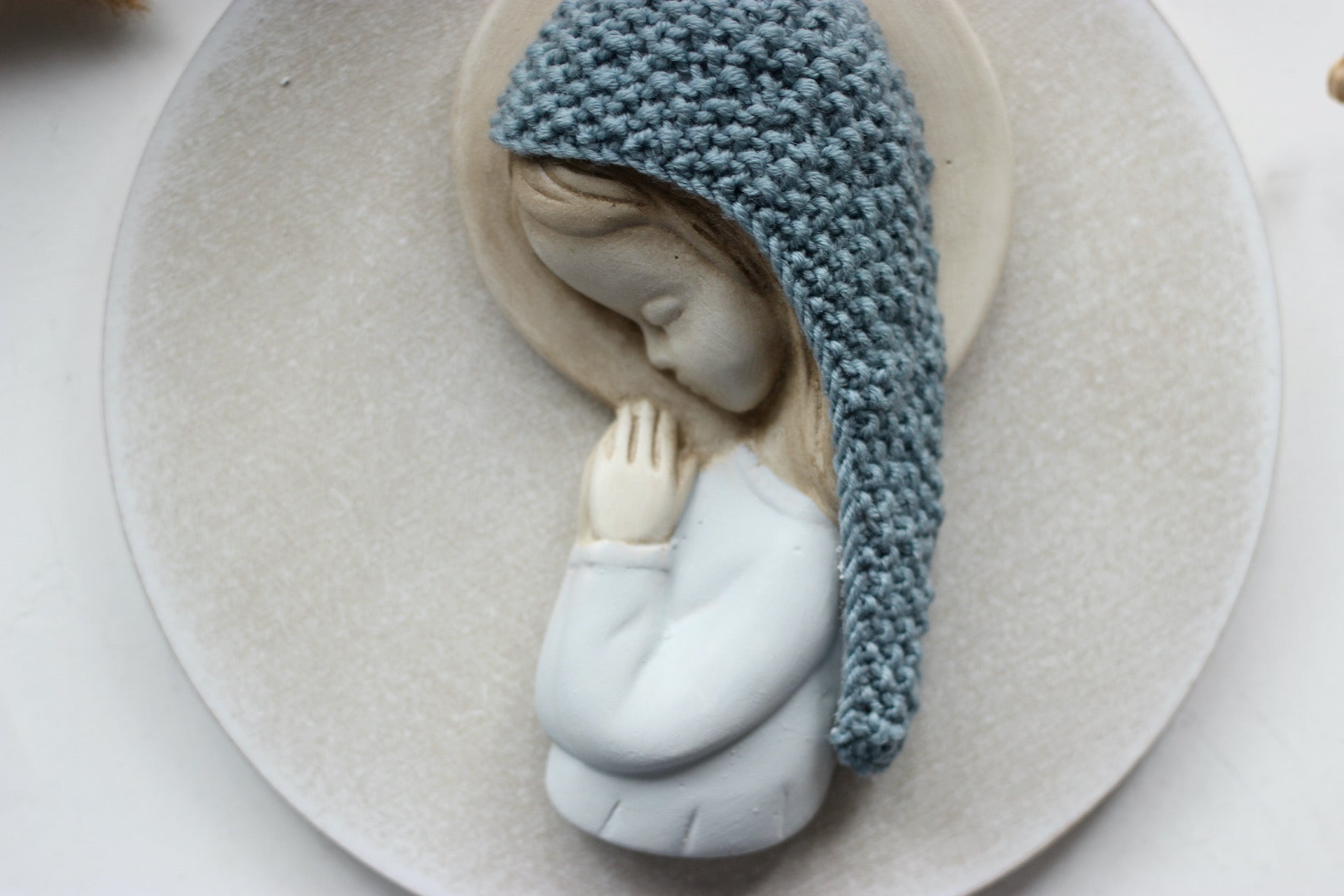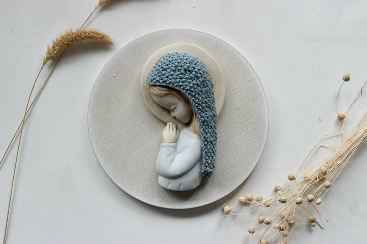 Esta virgencita es fruto de la colaboración entre Cosmen Company y Mezzetta Kids. Está moldeada y pintada por Leticia Mezzetta, y además lleva una fina capa de pan de oro en la corona. El manto es de algodón y está tejido en punto de arroz con grandes dosis de mimo y dedicación por Pilar, de Cosmen. El resultado es una pequeña obra de arte.