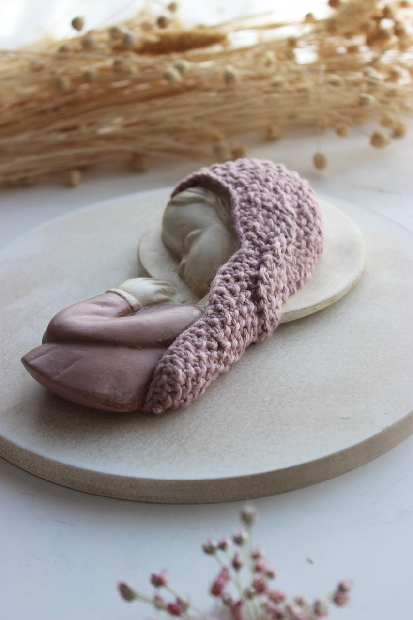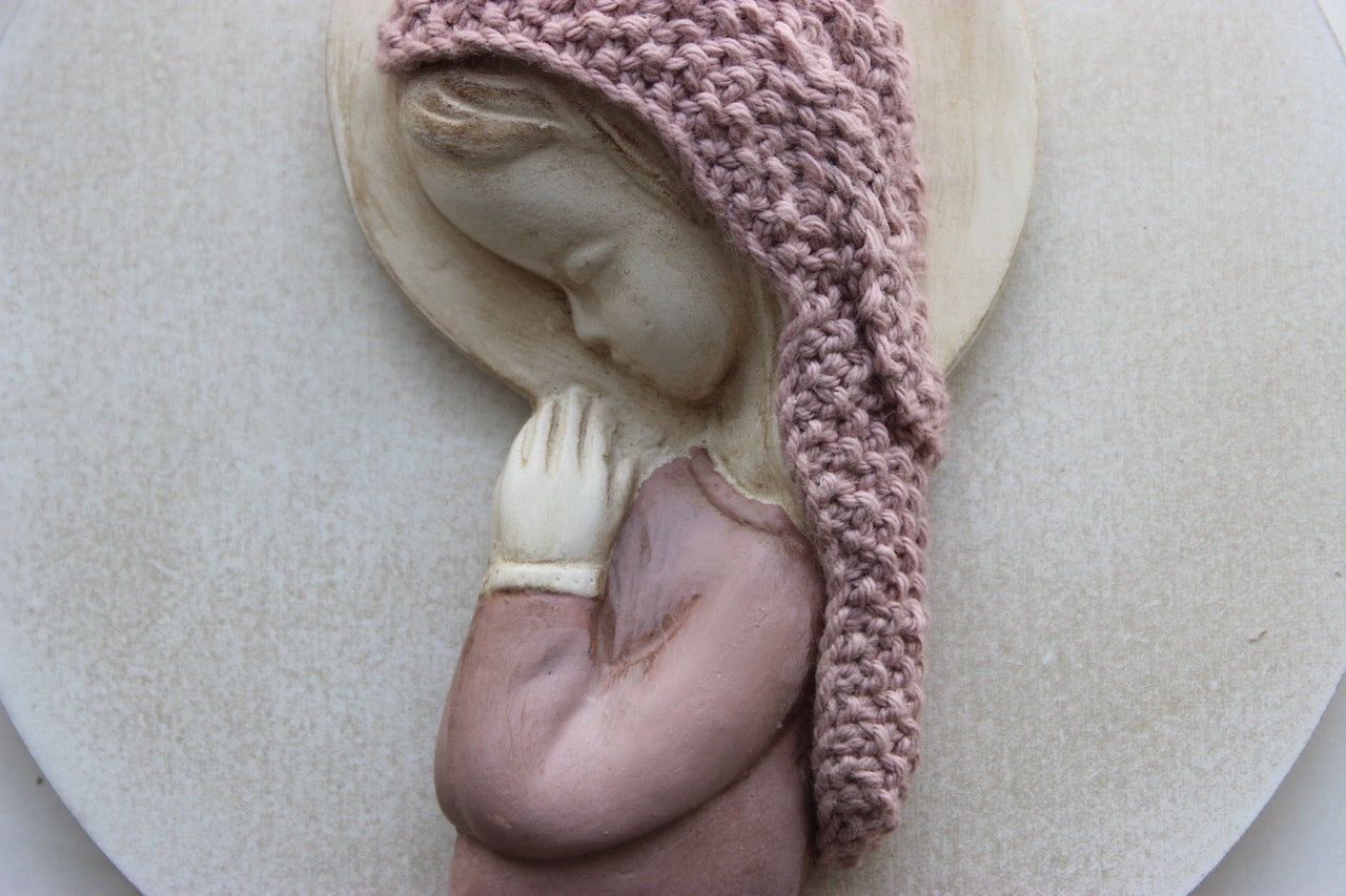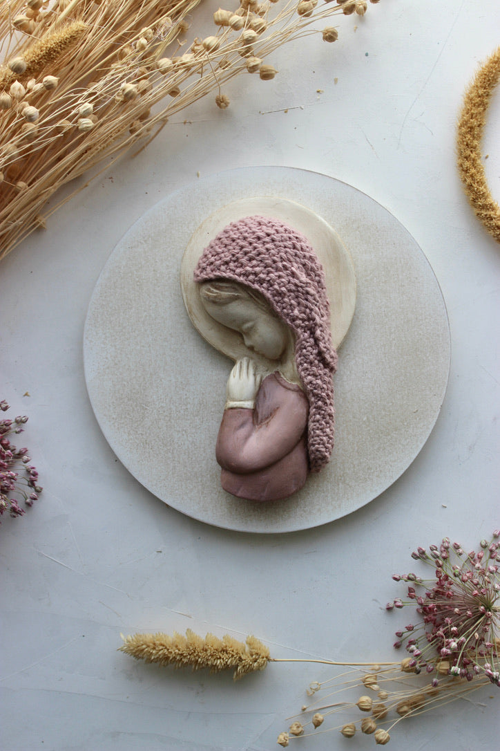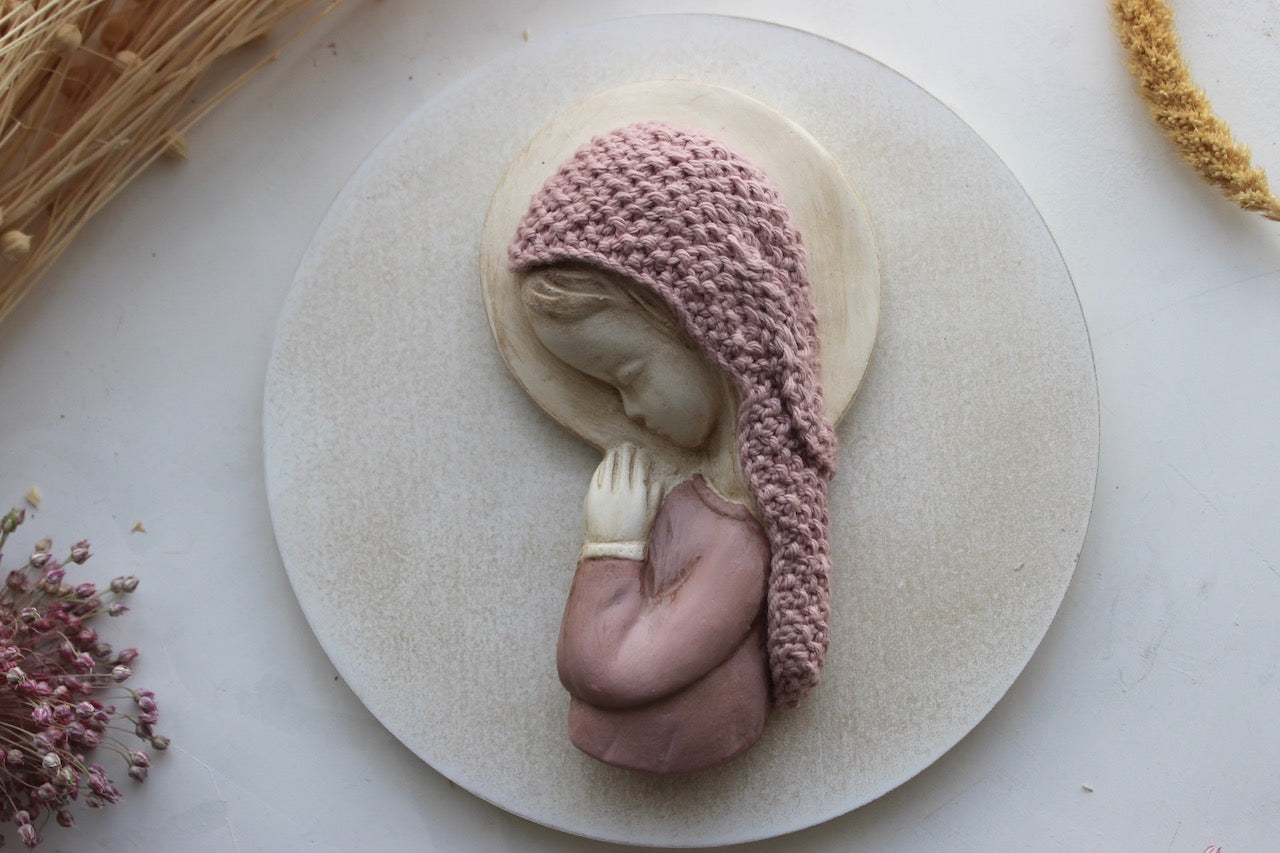 Esta virgencita es fruto de la colaboración entre Cosmen Company y Mezzetta Kids. Está moldeada y pintada por Leticia Mezzetta, y además lleva una fina capa de pan de oro en la corona. El manto es de algodón y está tejido en punto de arroz con grandes dosis de mimo y dedicación por Pilar, de Cosmen. El resultado es una pequeña obra de arte.