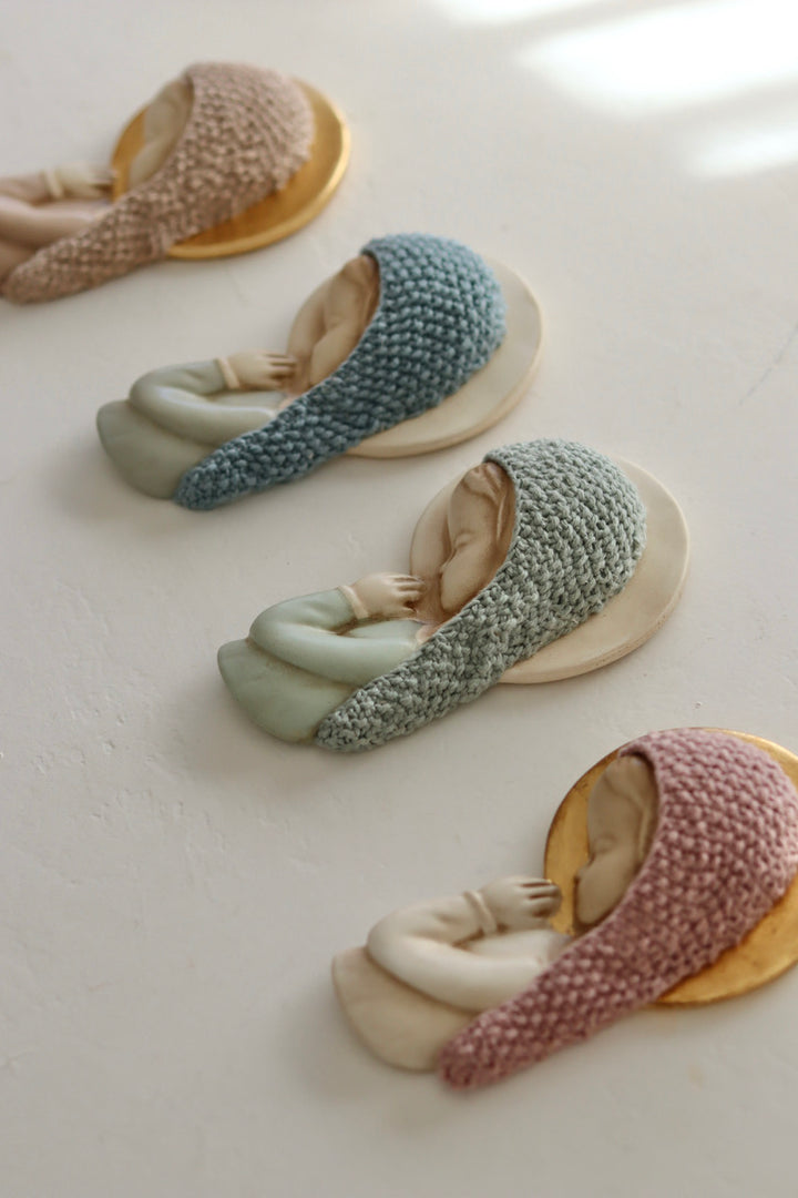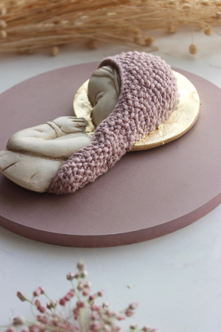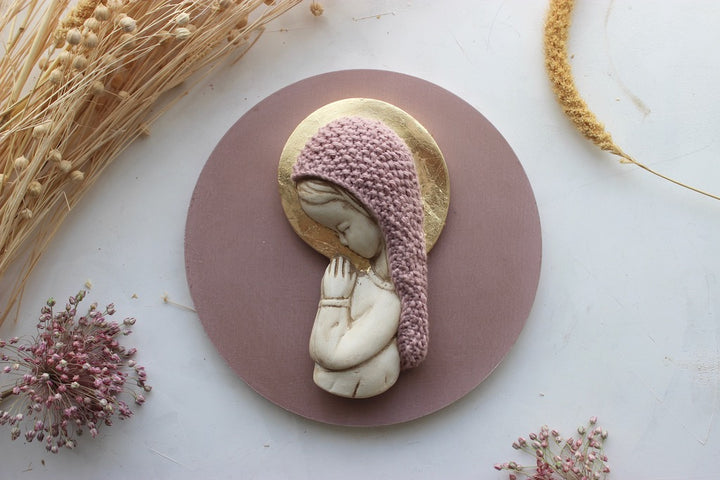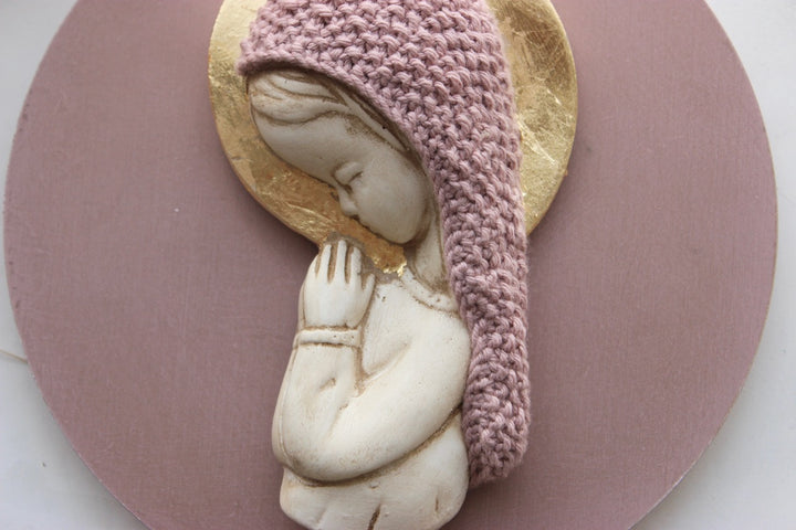 Esta virgencita es fruto de la colaboración entre CosmenCompany y Mezzetta Kids. Está moldeada y pintada por Leticia Mezzetta. El manto es de algodón y está tejido en punto de arroz con grandes dosis de mimo y dedicación por Pilar, de Cosmen. El resultado es una pequeña obra de arte.