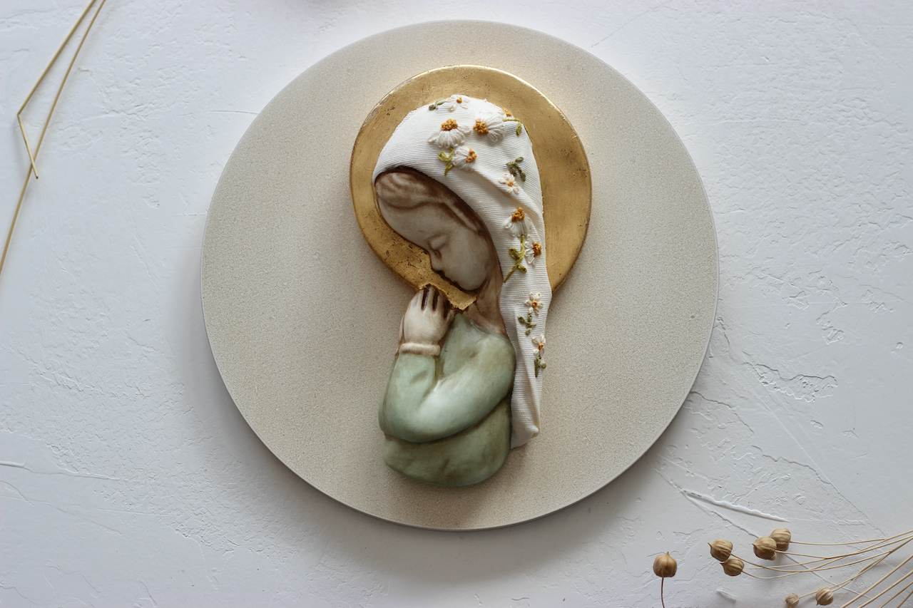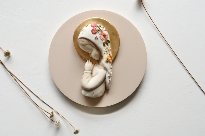 El trabajo artesanal, que es nuestro sello de identidad, en este caso se multiplica. En estas virgencitas está presente nuestro moldeado, pintura, envejecido, aplicación de pan de oro craquelado... y el trabajo de Carmen que ha bordado con mimo y delicadeza cada uno de los mantos de esta edición tan especial.